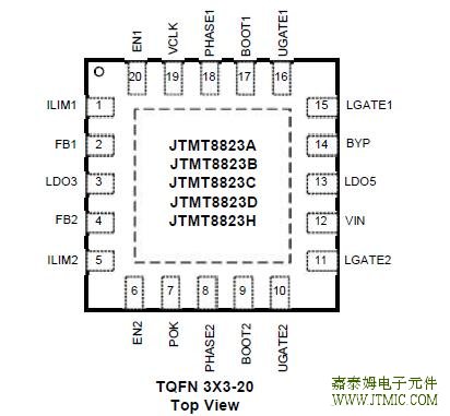 each PWM channels. Pulling both EN1/2 pin low shuts down the all of outputs unless LDO3 output. The LDO3 and LDO5 of JTMT8823B/C are always on standby power.The JTMT8823 is available in a TQFN3x3-20 package.