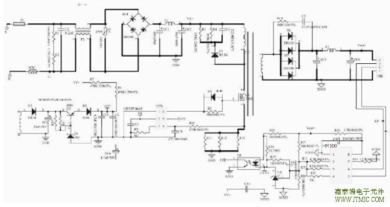 JM100 是一款支持 QC2.0 协议的 US. 高压充电接口芯片,芯片通过 D+、D-两个引脚的电平来判断需要输出的电压,然后通过 V1、V2 和 V3 这三个接入了电源反馈系统的端口,来控制输出电压达到需求值。当 SVCC 的电平达到 4V 后,芯片会在 20MS 之内开通 N5,以使 D+和 D-联通,并且保持 V1、V2 和 V3 几个口的开关管关断。 芯片连接 D+和 D-,使得充电适配器和被充电设备进行 US.1.2 充电