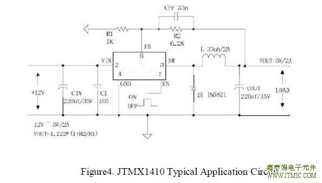 一,产品概述(General Description) The JTMX1410 is a 380KHz fixed frequency PWM buck (step-down) DC/DC converter,capable of driving a 2A load with high efficiency, low ripple and excellent line and load regulation. Requiring a minimum number of external components, the regulator is simple to use and include internal frequency compensation and a fixed-frequency oscillator. The PWM control circuit is able to adjust the duty ratio linearly from 0 to 100%. An enable function, an over current protection function is built inside. When short protection function happens, the operation frequency will be reduced from 380KHz to 80KHz. An internal compensation block is built in to minimize external component count. 二.产品特点(Features) Wide 3.6V to 18V Input Voltage Range Output Adjustable from 1.222V to 16V Maximum Duty Cycle 100% Minimum Drop Out 0.6V Fixed 380KHz Switching Frequency 2A Constant Output Current Capability Internal Optimize Power MOSFET High efficiency Excellent line and load regulation TTL shutdown capability EN pin with hysteresis function Built in thermal shutdown function Built in current limit function Built in output short protection function Available in SOP8L package 三,应用范围 (Applications) LCD Monitor and LCD TV Digital Photo Frame Set-up Box ADSL Modem Telecom / Networking Equipment 四.技术规格书下载(产品PDF)