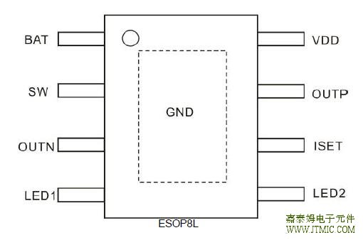 一,产品概述(General Description) JTMT4223 是一款专为移动电源设计的单芯片解决方案,内部集成了充电管理模块、放电管理 模块、电量检测及 LED 指示模块以及保护模块. JTMT4223 内置充电和放电功率 MOS,充电电流可以设定,最大充电电流和最大放电电流均为 1A. JTMT4223 内部集成了恒温充电工作模式、过温保护、过充与过放保护、输出过压保护、输出重 载保护、输出短路保护等几乎所有安全保护功能以保证芯片和锂离子电池的安全,同时 JTMT4223 应用 电路简单,只需很少元件便可实现充电管理与放电管理。 二.产品特点(Features) 充电放电状态指示以及 3 档电量指示 内置充电、放电功率 MOS 输入电压: 4.3V~5.5V 充电电流: 最大 1A 输出电流:最大 1A 输出电压: 5V BAT 放电终止电压:2.9V 预设 4.2V/4.35V 充电电压,精度达±1% 放电效率:85%(输入 3.7V,输出 5V/1A) 最大 8uA 待机电流 集成充电管理与放电管理 智能温度控制与过温保护 集成输出过压保护、短路保护、重载保护 集成过充与过放保护 支持涓流模式以及零电压充电 封装形式:ESOP8L 三,应用范围 (Applications) 移动电源 四.技术规格书下载(产品PDF)