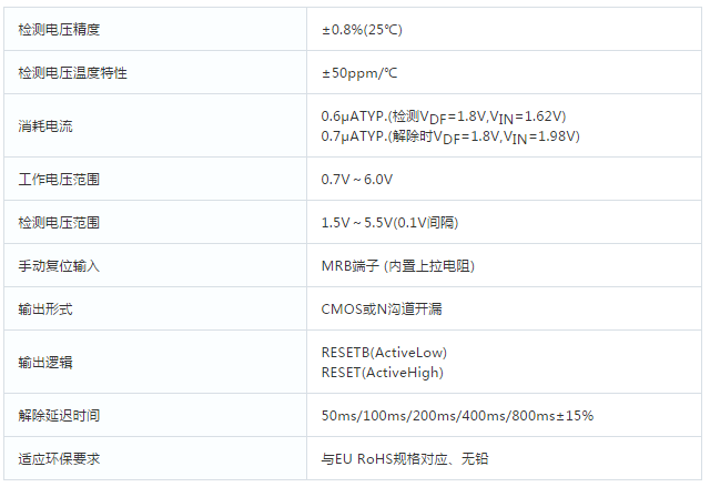 CXDR7550系列产品是超小型, 高精度内置延迟电路的电压检测器IC。由于采用了CMOS工艺, 高精度基准电源, 激光微调技术实现了包括温度漂移在内的高精度, 低消耗电流, 高精度延迟时间。内部微调可以在50ms到最长800ms之内设定解除延迟时间,能确保较长的复位时间。还可使用手动复位引脚(MRB)的强制复位功能。有N沟道开漏和CMOS两种输出,能从RESETB(Active Low)和RESET(Active High)中选择输出逻辑状态。备有USPN-4及SSOT-24,SOT-25三种超小型封装,适用于便携式仪器的小型化, 高密度实装以及取代既往产品。CXDR7550 series is ultra small highly accurate voltage detector with delay circuit built-in. The device includes a highly accurate reference voltage source, manufactured using CMOS process technology and laser trimming technologies, it maintains high accuracy, low power consumption, and accurate releases delay time over the full operation temperature range. The release delay time periods are internally set in a range from 50ms to 800ms. Moreover, with the manual reset function, reset can be asserted at any time. The device is available in both CMOS and N-channel open drain output configurations. Also detect logic is available in both RESETB (Active Low) and RESET (Active High). Ultra small package USPN-4 is ideally suited for small design of portable devices and high densely mounting applications. The conventional packages SSOT-24,SOT-25 is also available for upper compatible replacements.