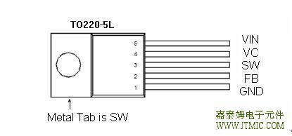 创新性集成多重保护机制:当检测到输出短路时,芯片自动激活智能频率折返功能,将工作频率从180KHz智能切换至48KHz安全模式。内置功率MOS、温度补偿网络及三重保护电路(过流/短路/热关断),配合自适应补偿技术,使外围元件数量减少35%,特别适用于高密度PCB布局。TO220-5L封装配合铜基散热片,可实现连续15W功率输出能力